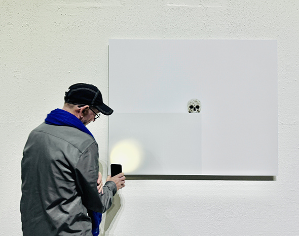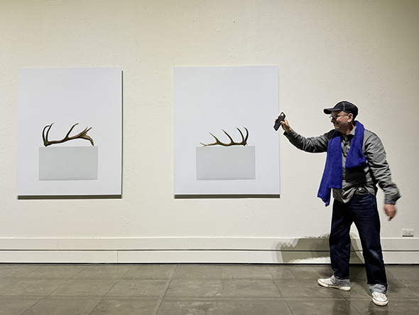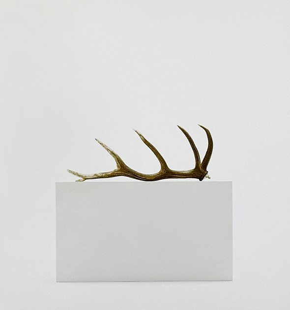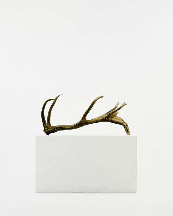 像這張作品裡鹿角下那個白框就美到不行,我在展場凝視許久,極度讚嘆後當場問埃里克:「你如何打光的,怎麼可以把那個白箱子拍得如此純淨無瑕?」